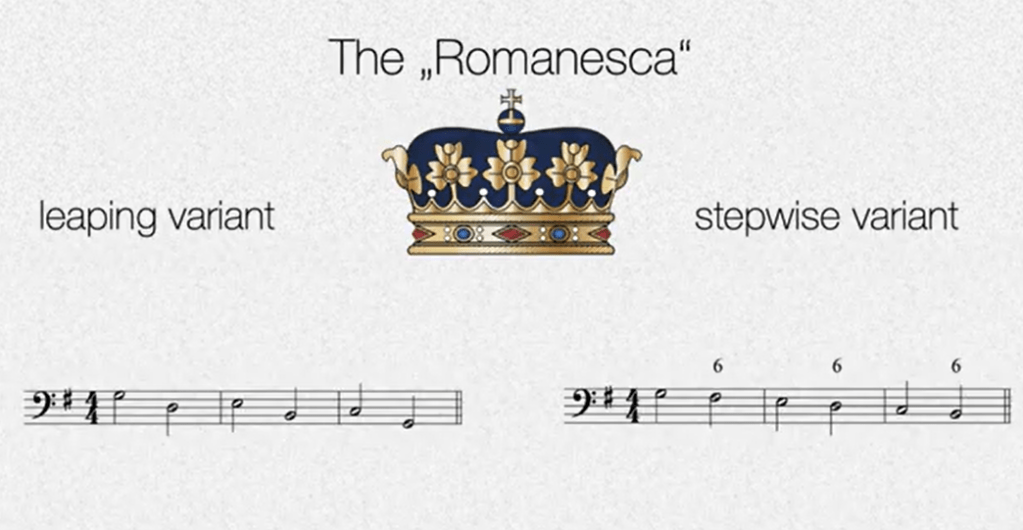 Le livre s’ouvre ainsi sur la fameuse Romanesca, qui nous évoque tous le début du canon de Pachelbel. Cette Romanesca, schema archaïque mais néanmoins emblématique et très séduisant, se présente souvent sous deux formes possibles, que le pédagogue Michael Koch a présenté comme ceci, par ces mouvements de basse :